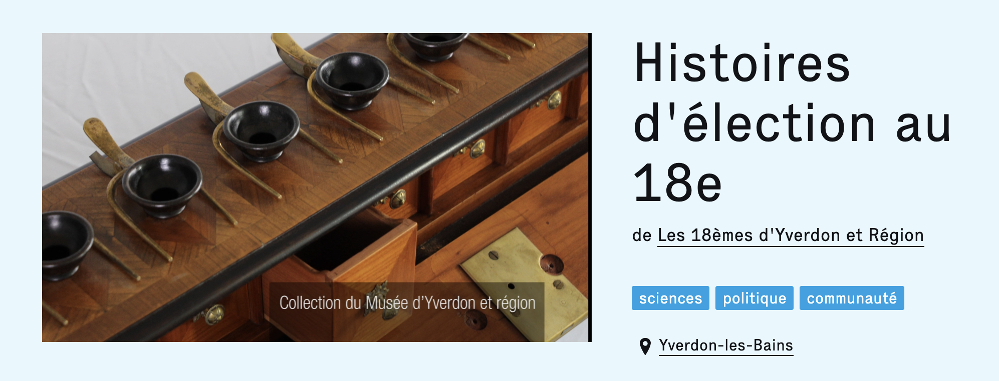 A l’origine du projet, il y avait deux très beaux scrutins à ballottes conservés au Musée d’Yverdon et région dont nous ne savions pas grand chose, si ce n’est qu’elles avaient été utilisées à l’époque bernoise pour élire les conseillers de la Ville. Les recherches se poursuivent actuellement dans les archives d’Yverdon et d’autres villes vaudoises pour comprendre le déroulement de ce processus d’élection et quelle place y occupait le tirage au sort.